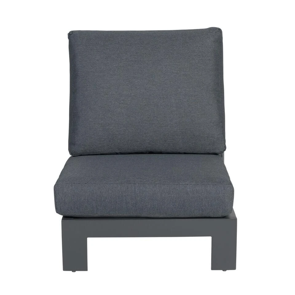 Het lounge midden element is compleet gemaakt van aluminium en heeft een stevige zwarte poedercoating. Dit aluminium frame is onderhoudsvrij en weerbestendig. De meegeleverde dikke polyester kussens zijn voorzien van een rits. De hoes is afneembaar en kan eenvoudig met de hand gewassen worden. De kussens zijn niet waterbestendig, maar wel waterafstotend. Stel dat er drinken op het midden element gemorst wordt, dan kan dit er gemakkelijk afgeveegd worden.