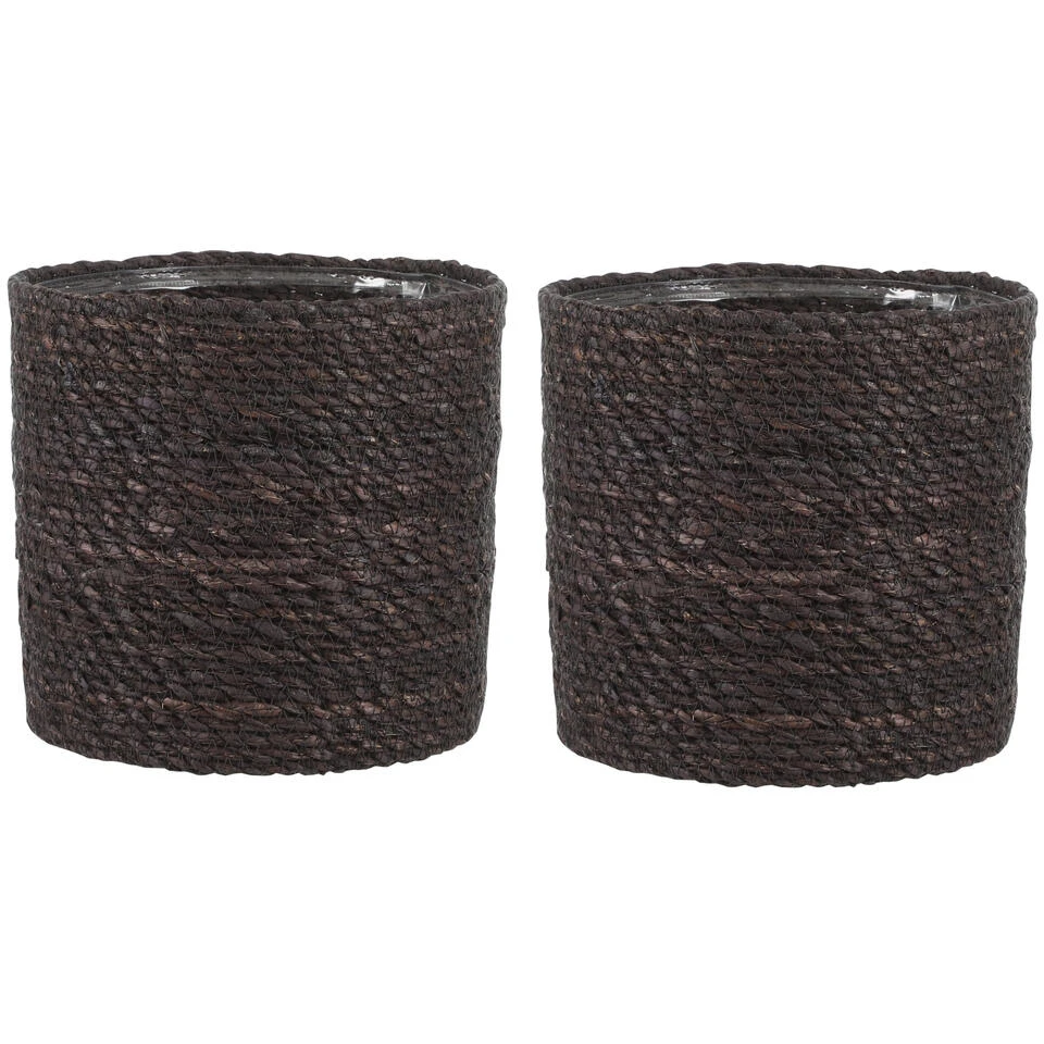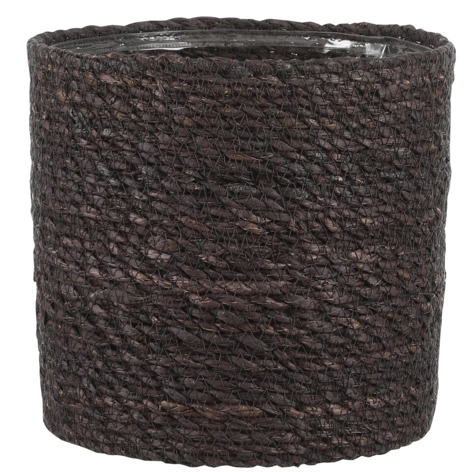 Naturel grijs kleur rotan planten pot mand van gedraaid jute/touw/riet/zeegras van 20 cm hoogte en 20 cm diameter(buitenzijde). Voor de binnenmaat trek je 3 cm af. Mooie rotan jute manden/mandjes voor bloemen, bloemstukjes en planten met plastic aan de binnenkant zodat het water er niet door gaat. De ronde rieten mand heeft geen gaatjes aan de onderkant.