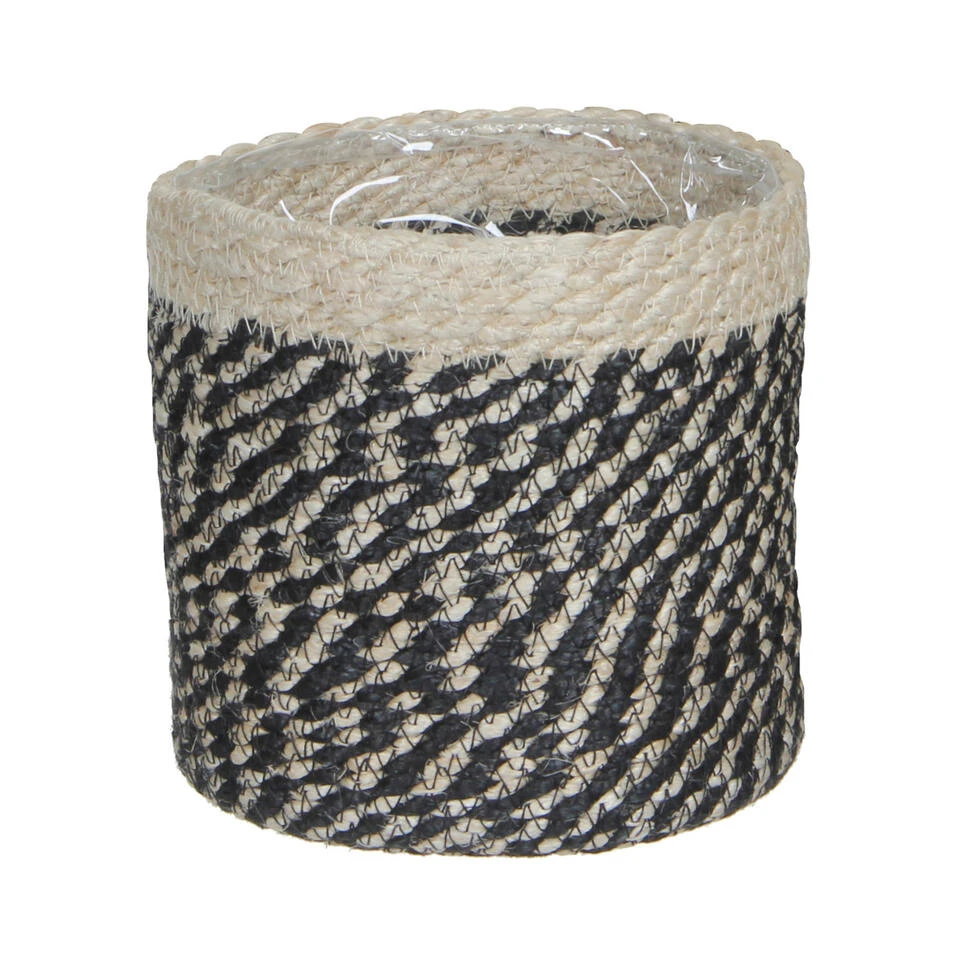 Naturel zwart kleur rotan planten pot mand van gedraaid jute/touw/riet/zeegras van 16 cm hoogte en 16 cm diameter(buitenzijde). Voor de binnenmaat trek je 3 cm af. Mooie rotan jute manden/mandjes voor bloemen, bloemstukjes en planten met plastic aan de binnenkant zodat het water er niet door gaat. De ronde rieten mand heeft geen gaatjes aan de onderkant.