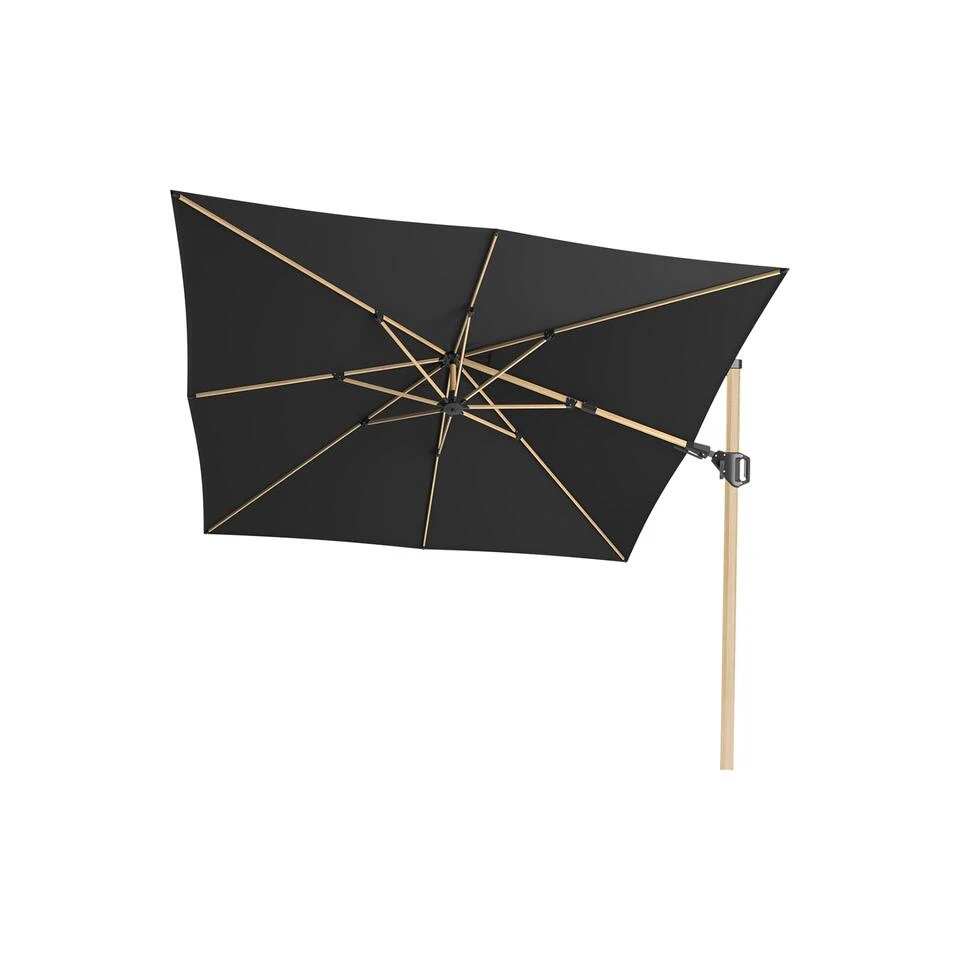 De parasol Challenger T2 3×3 meter met een faded black parasoldoek is een premium uitvoering van Platinum. De Challenger T2 is 3 meter breed en 3 meter lang. Dit betekend dat de parasol voldoende zonwering biedt. De zweefparasol is 360 graden draaibaar. Ook is het doek kantelbaar richting het bedieningspaneel. Deze functie is vooral makkelijk bij laagstaande zon. De meest speciale functie van de Challenger parasol is dat het doek in tegenstelling tot de T1 ook kantelbaar is naar links en rechts. De mast van de Platinum Challenger T2 is gemaakt van aluminium. De mast heeft een houtlook uitstraling. Het voordeel van aluminium is dat het licht van gewicht is, erg stevig en het materiaal kan niet gaan roesten. Net als de mast zijn ook de baleinen van de zweefparasols gemaakt van aluminium. Aan de uiteinde zijn doekspanners gemaakt. Deze zorgen ervoor dat het parasoldoek mooi strak blijft staan.