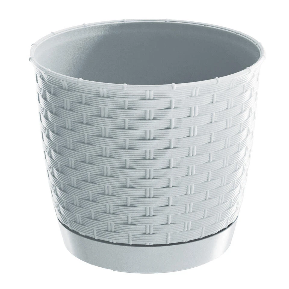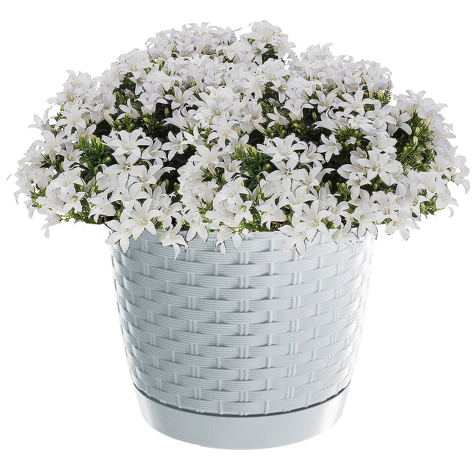 Ronde gevlochten plantenpot/bloempot kunststof dia 22 cm en hoogte 19.5 cm in het parel wit. Vorstbestendig ja. Basic Ratolla plantenpotten voor in huis, tuin, serre of op het balkon. De pot is voorzien van een water opvangbak.
