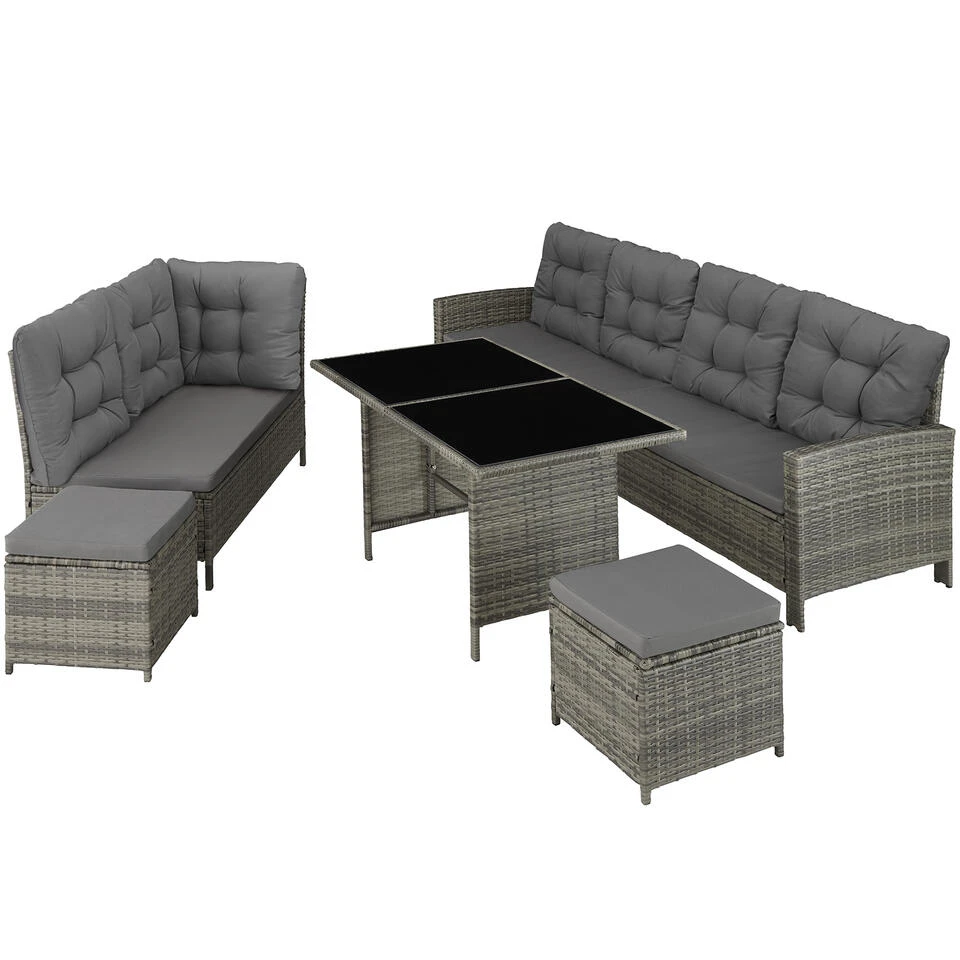 Geniet van gezellige en knusse momenten met familie of vrienden op deze schitterende wickerset. De zachte kussens op de banken zorgen voor optimaal zitcomfort. De krukken kunt u gebruiken als extra zitplaatsen voor visite of om uw benen op te steunen. De individuele elementen van de zitgroep zijn variabel verstelbaar en kunnen steeds opnieuw worden opgesteld. Het sterke frame van staal en het duurzame vlechtwerk van wicker garanderen de hoge belastbaarheid van onze ratanset.