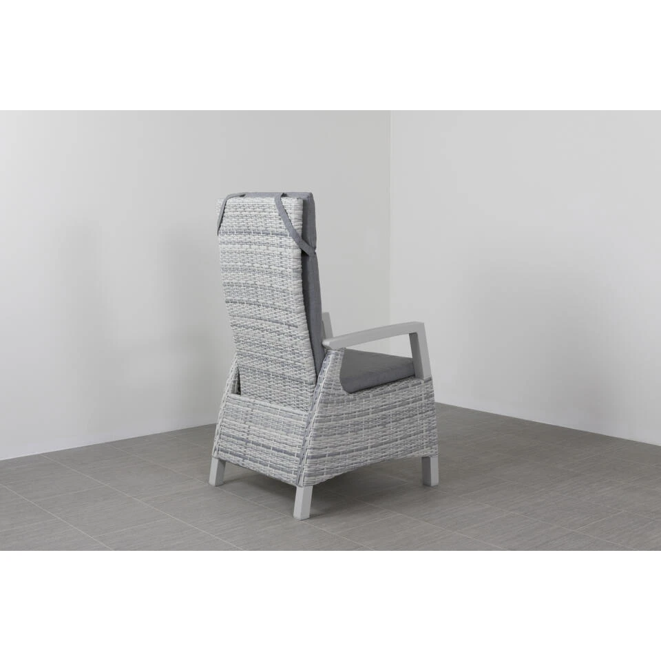 De Darwin tuinstoel heeft een alumininium frame. Om dit frame is kunststof wicker gevlochten in de kleur licht grijs. Wicker is een kunststof draad dat om het frame is gevlochten. De combinatie van een aluminium frame en kunststof wicker maken de tuinstoel erg onderhoudsvriendelijk. De armleuning van de verstelbare tuinstoel is van wicker en de zijkanten zijn open gehouden. Dit geeft de stoel een ruimtelijke uitstraling.