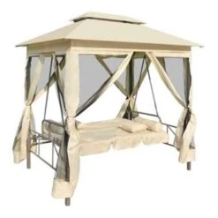 Dankzij de gordijnen met klittenbandsluiting kan je alle 4 de kanten makkelijk dichtmaken om een afgesloten gebied te creëren. Het gaas is perfect om insecten buiten te houden terwijl je ook een privévertrek creëert. De zitting kan omgebouwd worden tot een bed. Twee rechthoekige kussens en twee cilindervormige kussens worden meegeleverd voor extra comfort.